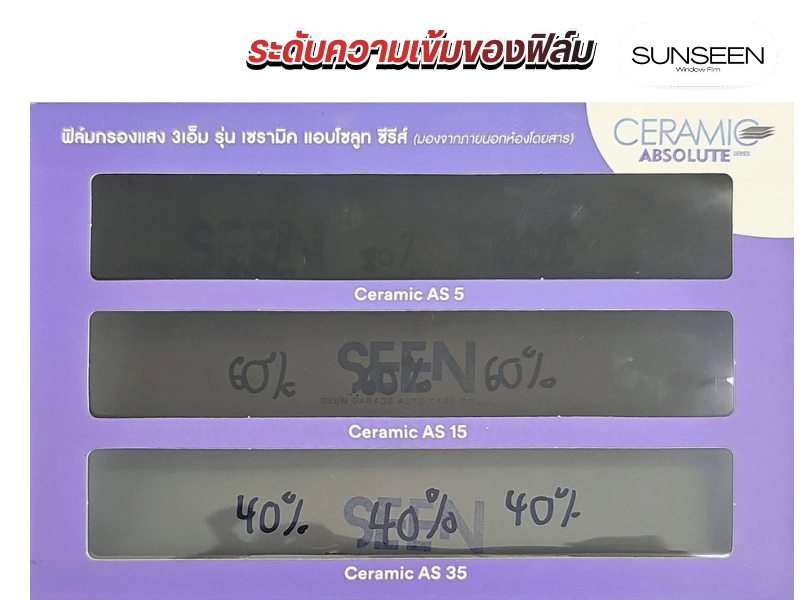 Sun Seen by Seen Garage ให้บริการติดตั้งฟิล์มกรองแสงระดับพรีเมียม ทั้งฟิล์มเซรามิคมีตั้งแต่เซรามิคเกรดละเริ่มต้น ไปจนถึงตัวท๊อปๆ ระดับพรีเมี่ยมเกรด และฟิล์มกันร้อน ที่ให้ความมืดเวลามองจากภายนอก แต่มองจากภายในสว่างชัดเจน เทคโนโลยีNano Ceramic จาก 3M ที่ให้ทั้งความสบายตา เคลียร์ชัด และประสิทธิภาพการกันความร้อนสูงสุด